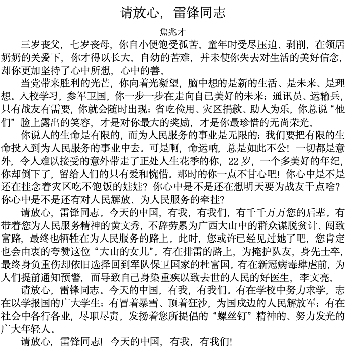 在活动中,22级应用化学专业的博士研究生焦兆才通过文章表示如今的中国有千千万万雷锋同志的后辈,有以学报国的广大学生,请雷锋同志放心。