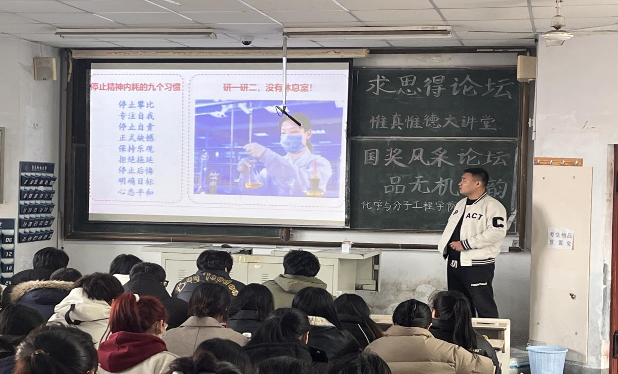 张家康累计发表高水平论文6篇,以第一作者发表论文3篇,在无机化学领域有着自己独到的见解和感悟。他从“德、智、体、美、劳”五个方面详细讲述自己的心得,强调在实验的过程中一定要注意安全和健康,并将自己取得成就的经验分享给同学们,激励同学们在学习中勇攀科研高峰。王月累计发表第一作者SCI论文4篇,发明专利2项。王月根据自己的日常实验情况为大家传授经验,她强调,要想取得一定的科研成果,勤奋努力是必不可少的。王成斌在SCI一区发表学术论文两篇。王成斌分享自己获奖经验及感悟,他表示,做实验不仅要勤奋刻苦,还要保持健康阳光的心态。