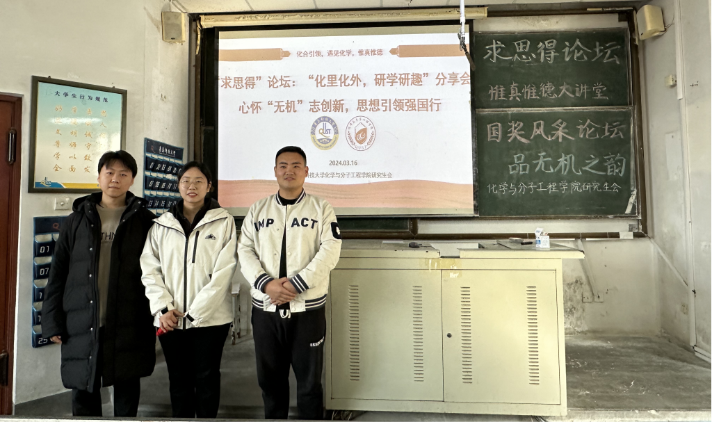 2024年3月16日,化学院研究生于四方校区第一教学楼202室开展“求思得”论坛:“化里化外,研学研趣”分享会。此次分享会主题为心怀“无机”志创新,思想引领强国行。邀请化学院2023年国奖获得者张家康、王月、王成斌出席并分享心得,化学院全体研究生参与此次活动,刘凯昱任主持人。