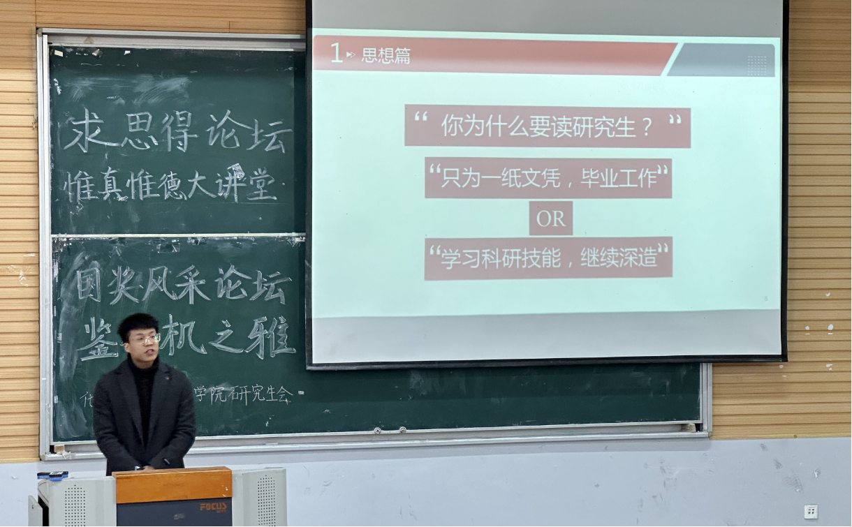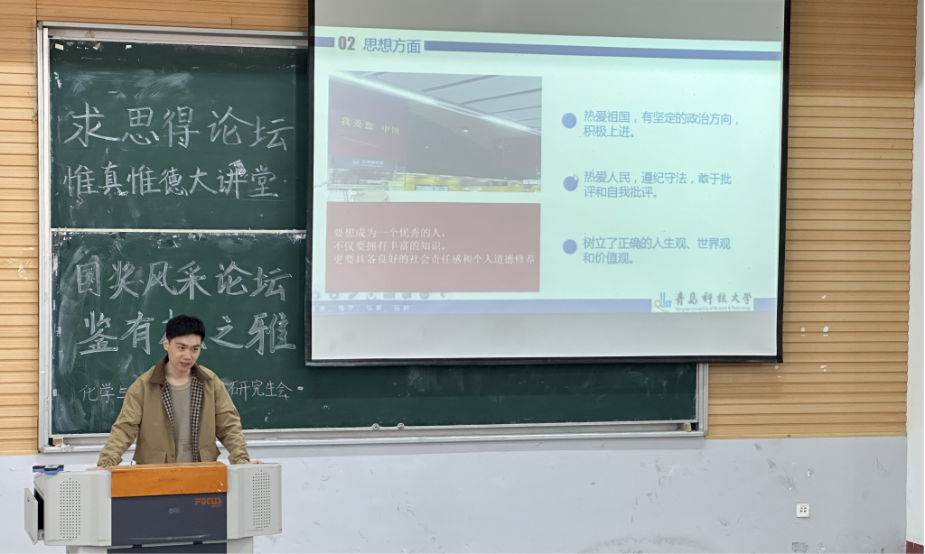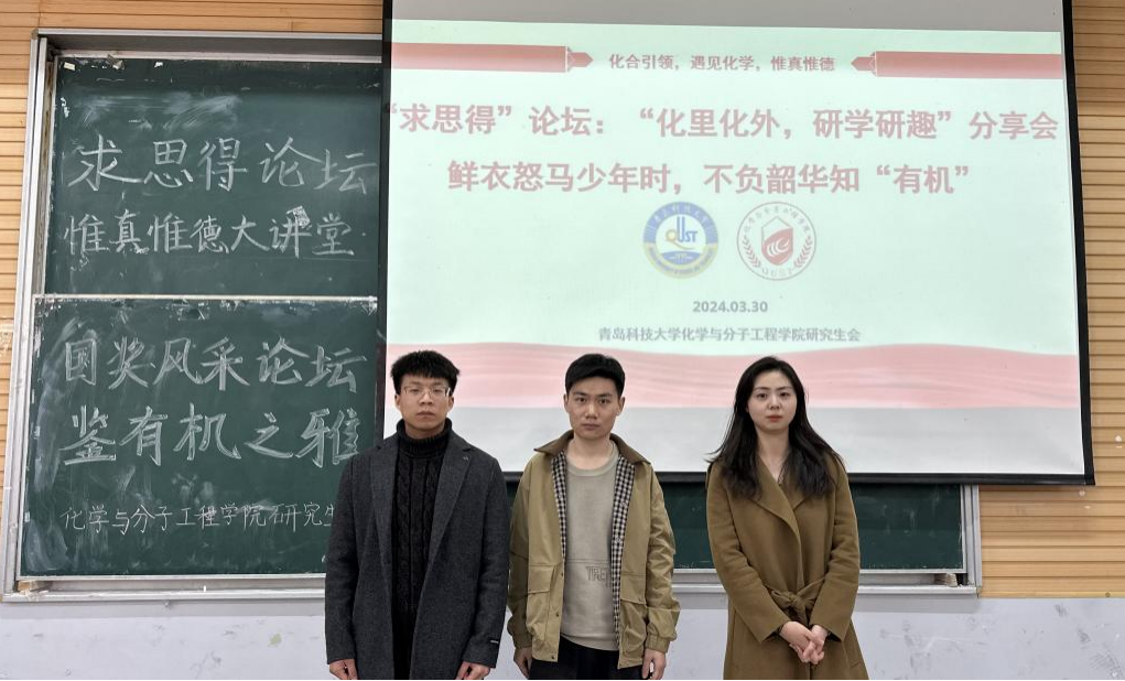 为充分发挥优秀青年榜样的引领作用,营造良好的学习氛围,激发我院研究生投身科研的热情,促进有机化学领域的学术交流,营造浓厚的学术氛围,进一步加强化学院“惟真惟德”的学风建设。2024年3月30日下午两点,化学院研究生在二教101室开展“求思得”论坛:惟真惟德大讲堂之国奖风采论坛——鉴有机之雅。本次分享会邀请2023-2024年研究生国家奖学金获得者徐浩、王子璇、王云虎作为主讲嘉宾。