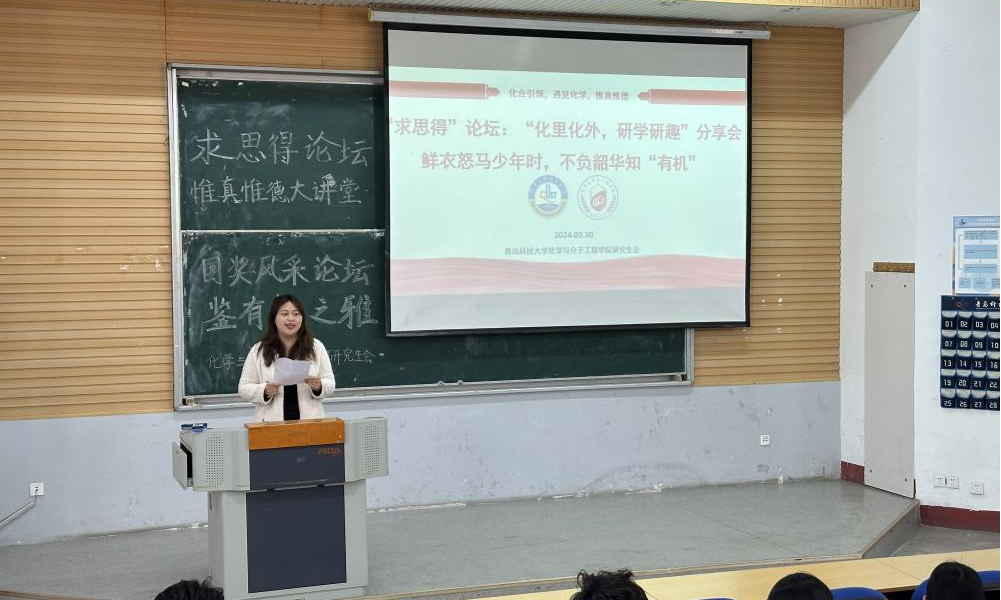 为帮助研究生解答科研生活中的困惑,助力研究生专业成长与全面发展,激发我院研究生对科研的热情,推动有机化学领域的学术交流,打造深厚的学术底蕴,进一步强化化学院“惟真惟德”的学风建设。2024年3月30日下午,化学院研究生在二教101室开展“求思得”论坛:“化里化外,研学研趣”——鲜衣怒马少年时,不负韶华知“有机”专题报告会。本次分享会邀请2023-2024年研究生国家奖学金获得者徐浩作为主讲嘉宾。