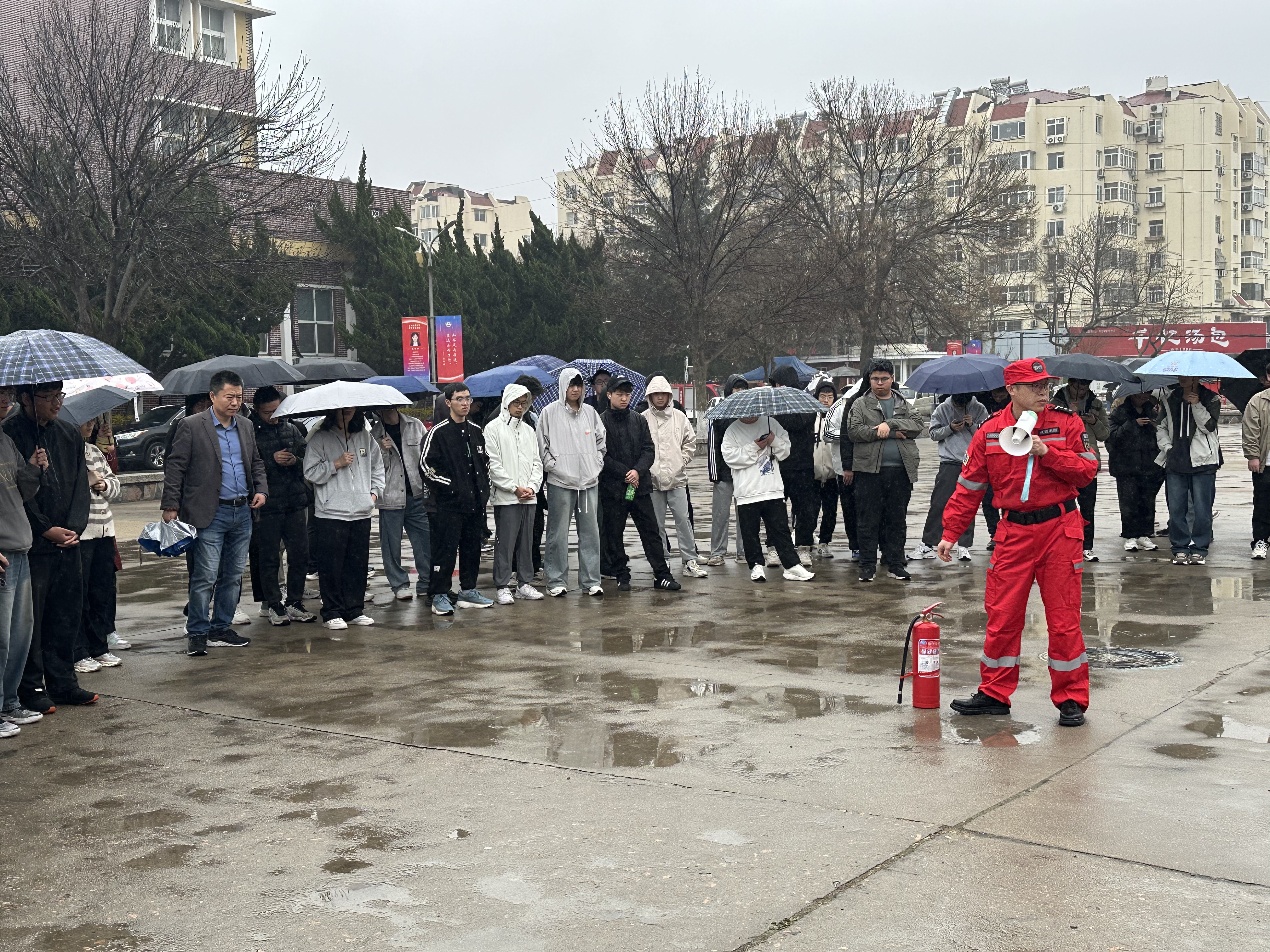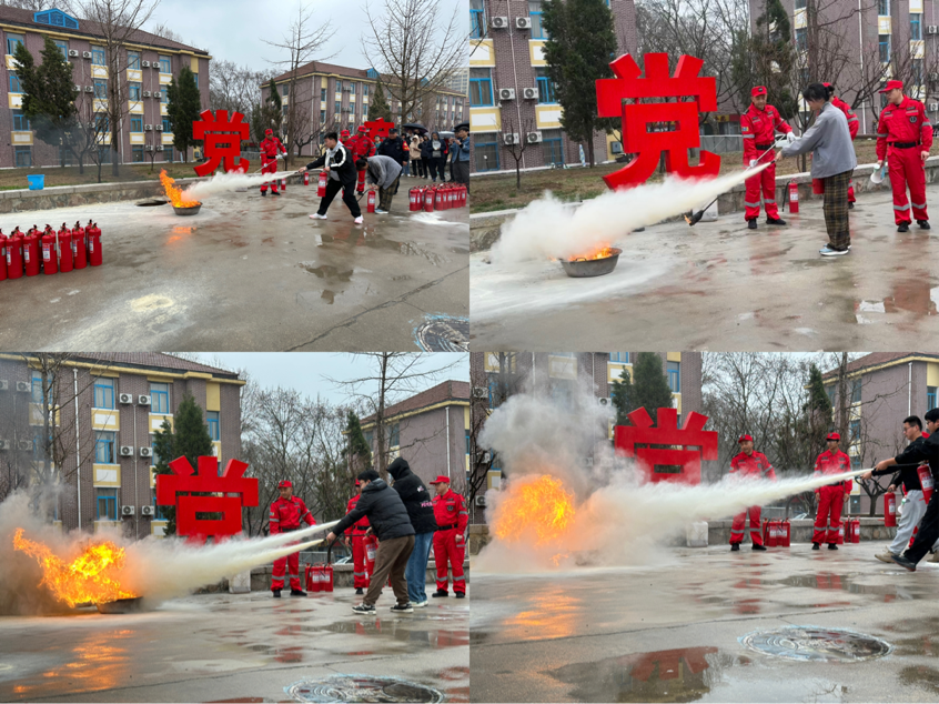 逃生演练结束后,保卫处消防科老师向参演同学介绍了消防安全知识,演示了灭火器的使用和维护方法及注意事项,并指导学生们使用灭火器,同学们规范、快速地完成了灭火过程。