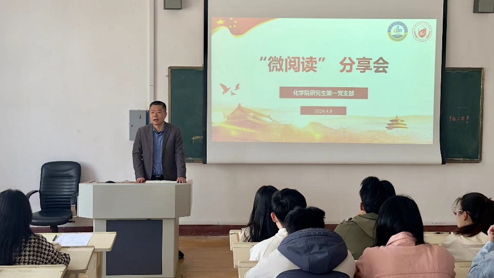 为深入学习贯彻习近平新时代中国特色社会主义思想,进一步建设“科创型、学习型、先锋型”党支部,打造“红色分子”党建品牌,于2024年4月9日一政243化学院研究生第一党支部开展第一季度微阅读分享会,从而引导支部党员以读书提升修养,以读书促进履职,培养阅读习惯,营造党内学习氛围,响应建设书香校园的号召。化学院党委副书记刘尧出席本次会议。