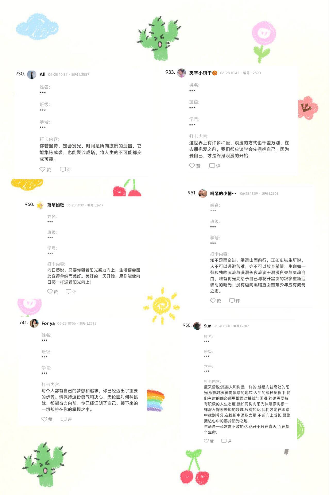 通过一周的健康打卡加油活动,参与者们深刻体验到了“悦己”带来的愉悦和满足,学会了如何更好地关注自己的内心需求、实现自我成长和内心满足。同时,活动也促进了同学们之间的相互理解和支持,营造了积极向上的校园氛围。化学院心理将继续关注学生的心理需求,开展更多形式多样的心理健康教育活动,为促进学生身心健康发展贡献力量。(通讯员:闵繁盛、陈佳欣)